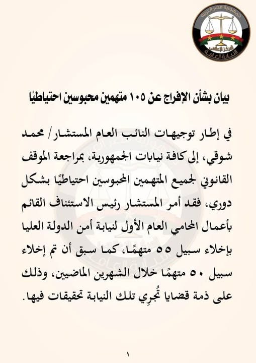 النيابة العامة تخلي سبيل 105 متهمين محبوسين احتياطيا
