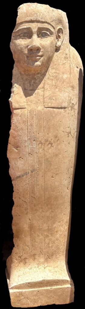 وأضافت: في داخل المقبرة، عُثر على تابوت من الحجر الجيري يبلغ ارتفاعه نحو مترين، موضوع فوق منصة صخرية نُحتت مباشرة في الجبل، ويتميز بغطاء على هيئة آدمية يحمل ملامح واضحة لوجه إنسان مزين بباروكة وزخارف مذهلة، بالإضافة إلى عمودين من النصوص الهيروغليفية التي تسجل أدعية للآلهة المحلية بمنطقة أسوان، واسم صاحب المقبرة “كا-مِسيو”، وهو أحد كبار المسؤولين في عصره، إلى جانب أسماء أفراد من أسرته، كما تم العثور على مومياوات بعضها لأطفال.