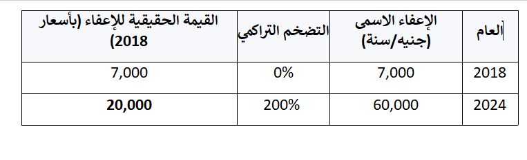 النتيجة ان الاعفاء المرتفع البالغ 60 الف جنيه في 2024 لا يعادل سوى 20 الف جنيه بقيمة 2018 اي ان العامل الذي يكسب 60 الف جنيه سنويا أي 5 الاف جنيه شهريا وهو معفى رسميا من الضريبة يعيش اليوم بقوة شرائية اقل من عامل كان يكسب 20 الف جنيه في 2018 معفى ايضا فالاعفاء لم يرتفع حقيقة بل تآكل.