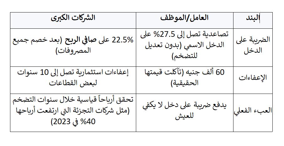 في الوقت الدي تطبق الدولة الضريبة على الدخل بشكل تصاعدي متدرج أقصاها يصل الى 27.5% على الدخل الاسمي بدون تعديل للتضخم تطبق علي الشركات و أصحاب رؤؤس الأموال ضريبة بسعر 22.5% على صافي الربح أي بعد خصم جميع المصروفات بما فيها أجور العمال انفسهم و في الوقت الذي ثبت فيه ان الاعفاء المقدر ب 60 الف جنيه قد تآكل قيمتها الحقيقية هناك اعفاءات استثمارية تصل الى عشر سنوات لبعض القطاعات الصناعية و الخدمية و بالتالي نجد ان النظام الضريبي ليس الا أداة لنقل و تحويل العبء من راسمال الي العمل