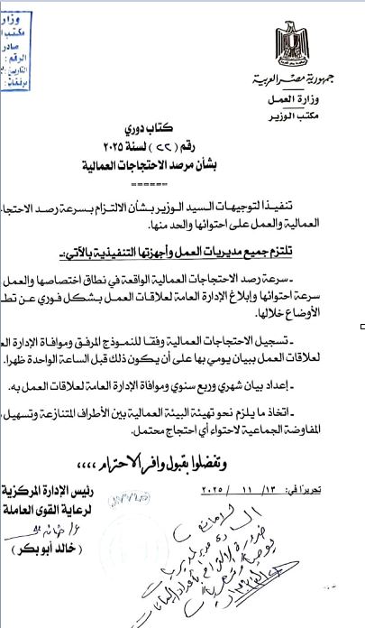 فجأة ظهر كتاب دوري جديد صادرعن وزارة العمل يحمل عنوان مرصد الاحتجاجات العمالية ويطالب المديريات بسرعة رصد الاحتجاجات وتجميع بياناتها وإرسالها للإدارة العامة لعلاقات العمل ليس بهدف التدخل السريع أو البحث عن حلول عادلة ولا حتى باعتبار هذه التحركات مؤشراً لخلل في علاقات العمل بل باعتبارها معلومة يجب حصرها ثم وضعها على مكتب الوزير في تقرير شهري او ربع سنوي وكأن الوزارة تلعب دور مراقب من بعيد لا يعرف ولا يريد أن يعرف ما الذي يدفع العامل للوقوف خارج بوابة المصنع او للتجمهر في ساحة الورشة او لقطع الطريق أمام مقر الشركة احتجاجاً على تأخر الرواتب او التسويات او عدم تطبيق قانون العمل الجديد
