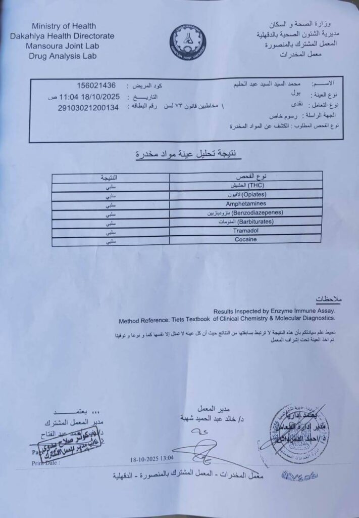 لكن بحسب المصدر، فإن عبدالحليم بادر بإجراء تحليل ثانٍ في نفس المركز وبنفس الإجراءات، وجاءت النتيجة سلبية تمامًا، أي تؤكد خلوه من أي مواد مخدرة.