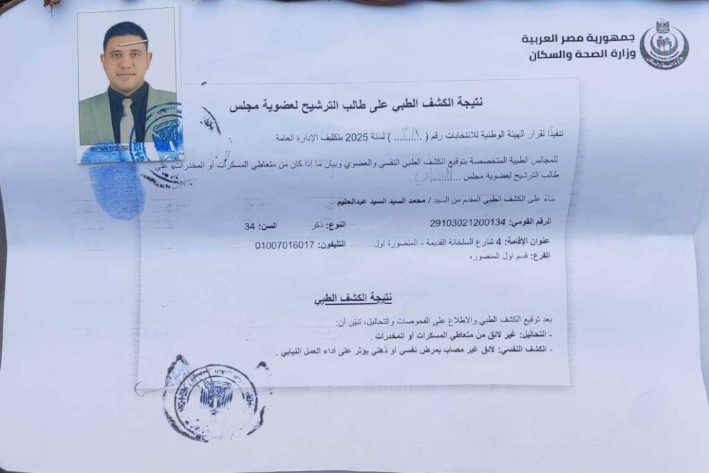 وأضاف أن الجهة طالبت المرشح بإعادة التحليل مرة ثالثة، مع سداد تكلفة مالية جديدة تبلغ 10 آلاف جنيه، رغم وجود تضارب واضح بين النتيجتين السابقتين.