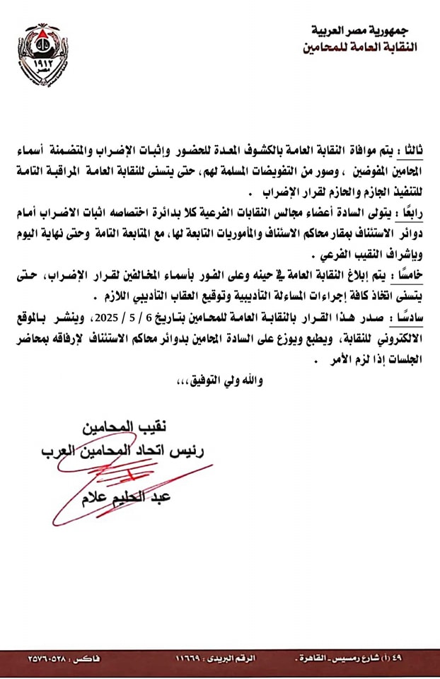 كما شدد القرار على متابعة تنفيذ الإضراب بإشراف النقابات الفرعية، وإبلاغ النقابة العامة بأسماء المحامين المخالفين لقرار الإضراب لاتخاذ الإجراءات التأديبية بحقهم.