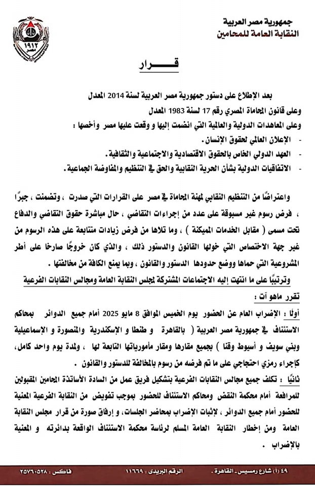 وأوضح علام، في بيان صادر عن النقابة العامة، أن القرار يأتي استنادًا إلى الدستور المصري وقانون المحاماة، إضافة إلى المعاهدات الدولية التي تكفل الحق في التنظيم والاحتجاج السلمي، مؤكدًا أن ما تم فرضه من رسوم جاء بالمخالفة لأحكام الدستور والقانون، ومن جهات غير مختصة، ما اعتبره خروجًا صارخًا على الشرعية القانونية والدستورية.